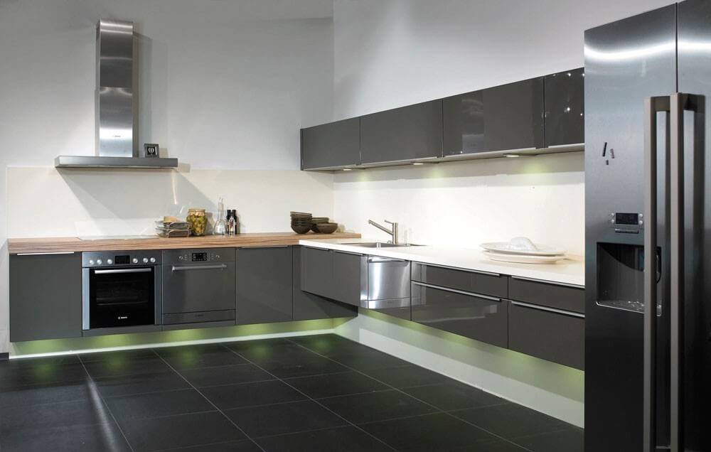 светодиодной лентой. Этот вариант наиболее популярен. Цвет подсветки может быть, как в тон гарнитура, так и контрастен ему. Монохромную подсветку выбирают для стиля минимализм, яркие и контрастные оттенки имеют большее распространение в стилях модерн и хай-тек;