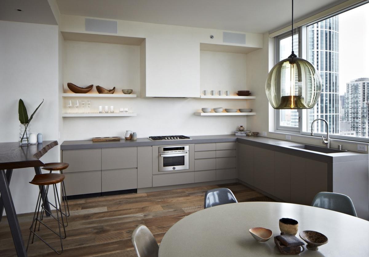 В открытых кухнях часто уходят от классических верхних подвесных шкафов в пользу множества стилистических вариаций, включая кухонную мебель, полностью лишенную их. Выбор зависит от потребностей, предпочтений жильцов.