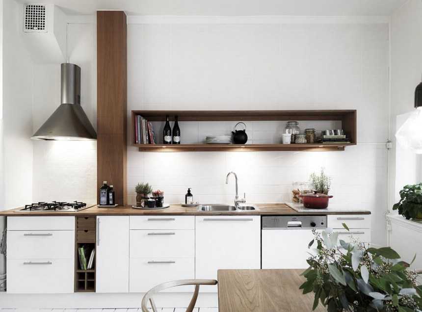 Полки вместо навесного шкафа: варианты дизайна кухонного гарнитура