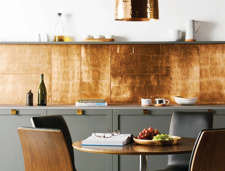 Золото и серебро на кухонной мебели — это универсальный выбор, который сочетается практически с любым цветом мебели. Однако на белых или черных поверхностях эта патина раскрывает весь свой потенциал. Вещество также эффективно на светлой древесине.
