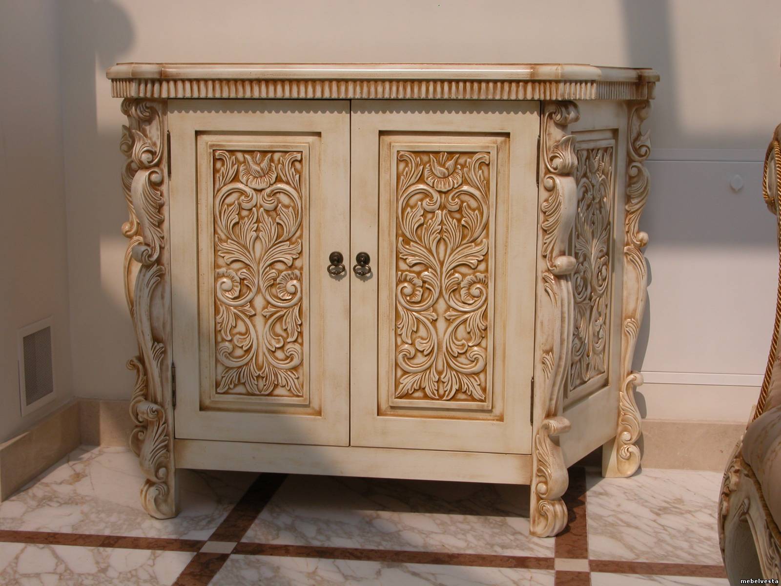 - Выделить резные узоры на фасадах поможет контрастная патина – под золото, серебро, медь, бронзу. Сначала состав втирают в элементы фрезеровки, например, по углам или на стыках рамки и филенки, и уже потом наносят тонкий основной слой и равномерно распределяют по поверхности дверцы.