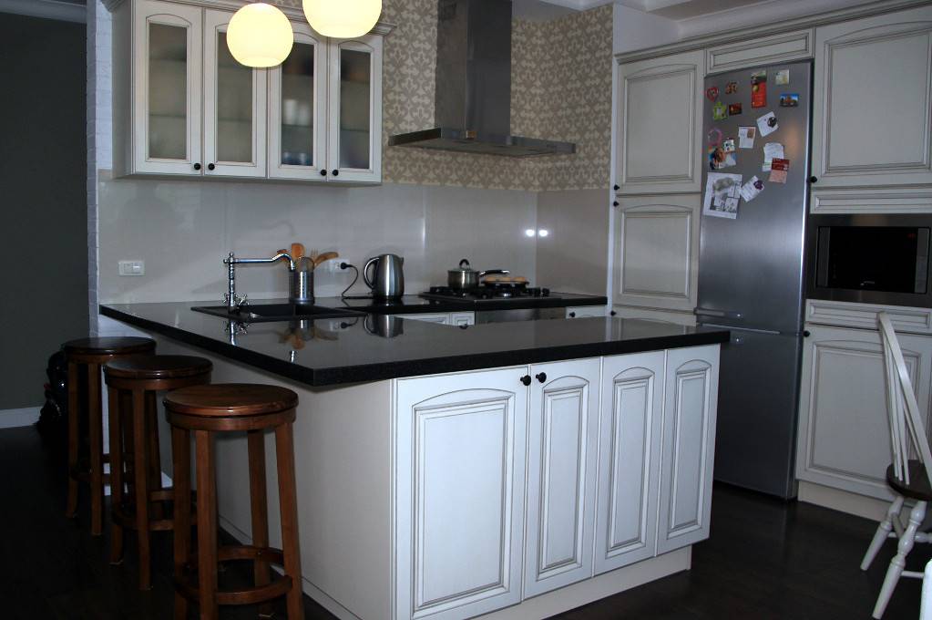 - П-образная. Такая планировка предполагает наличие довольно большой площади, так как центр комнаты при такой расстановке мебели, в большинстве случаев, выделяется под обеденную зону. С учетом того, что для комфортного перемещения по кухне расстояние между обеденной зоной и столешницей должно быть не менее 60 см, путем нехитрых вычислений, можно выяснить, что площадь П-образной кухни должна быть более 12 м2. Если подобный проект нужно реализовать в кухне меньшей площади, то, путем воплощения вышеописанных «хитростей», можно сократить необходимый минимум до 10 м2, но это предельно маленькая площадь для такой планировки.