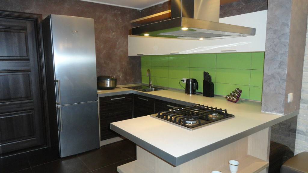 — Широкая столешница (обычно 90 см) одновременно служит барной стойкой и в маленькой квартире позволит обойтись без обеденного стола.