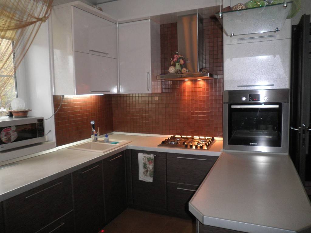 - Г-образная. Кухни типовой застройки больше всего подходят для Г-образной планировки. В этом случае рабочая зона получается весьма обширной, а достаточное количество шкафчиков и ящиков позволяют удобно расположить всю кухонную утварь и бытовые приборы. При этом остается большое количество свободного пространства для обустройства обеденной зоны. Помимо этого, есть ряд «хитростей», повышающих комфорт кухни с минимальной площадью: