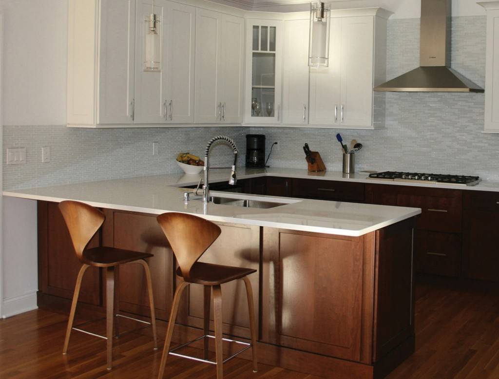Совет: для создания асимметричного образа полуостров делают короче ряда шкафов, расположенных на задней стене помещения. Рассчитайте метраж таким образом, чтобы хватило места для дополнительного стула.