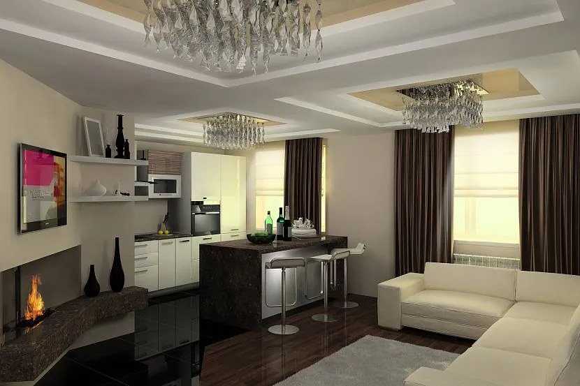 Гостиная зона может быть освещена настенной лампой. Рабочая зона, с другой стороны, освещается прожекторами. Чтобы подчеркнуть единство помещений, используется потолок со встроенными светильниками по периметру. Фото из источника: dizajn-gostinoj. Даже если пол и стены отделаны разными материалами, они должны выглядеть гармонично.