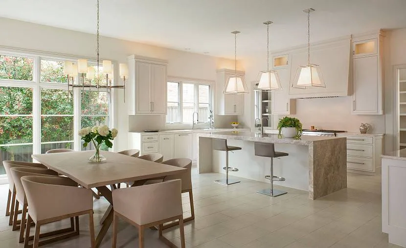 Имея большую площадь или два помещения чаще даже не приходится задумываться о том, как правильно все организовать. Достаточно совместить две комнаты и оформить их в едином или приближенном дизайне кухни-столовой
