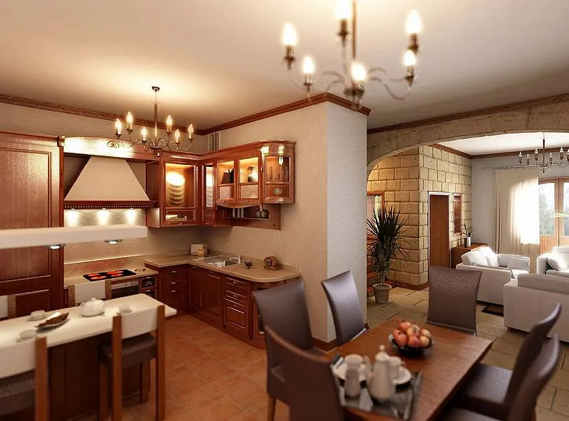 Чтобы объединенные кухня и гостиная выглядели как единое пространство, их нужно было оформить в одинаковой или похожей цветовой гамме. Фото из источника: zhilfond-realt. В идеале каждая зона должна иметь собственное освещение. В обеденной зоне установлена люстра, соответствующая общему стилю помещения.
