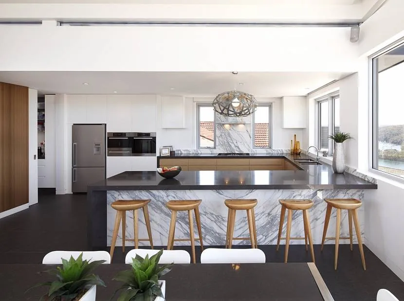 Этот стильный и функциональный предмет мебели может стать изюминкой интерьера. Размеры барной стойки зависят от количества проживающих людей. Барная стойка с лаконичными высокими стульями может стать не просто способом зонирования, а ещё и обеденной зоной, заменив собою полноразмерный стол и стулья. Этот предмет мебели может быть полуостровной частью гарнитура или отдельно стоящим. Часто в качестве основания стойки используется оставшаяся часть демонтированной стены, на которую ставят столешницу.