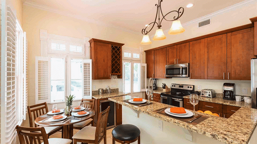 - Обеденная зона устанавливается возле окна или у глухой стенки (в зависимости, чем заканчивается кухня). При полном отсутствии для неё места, используется барная стойка, передвижные конструкции, столы-трансформеры.