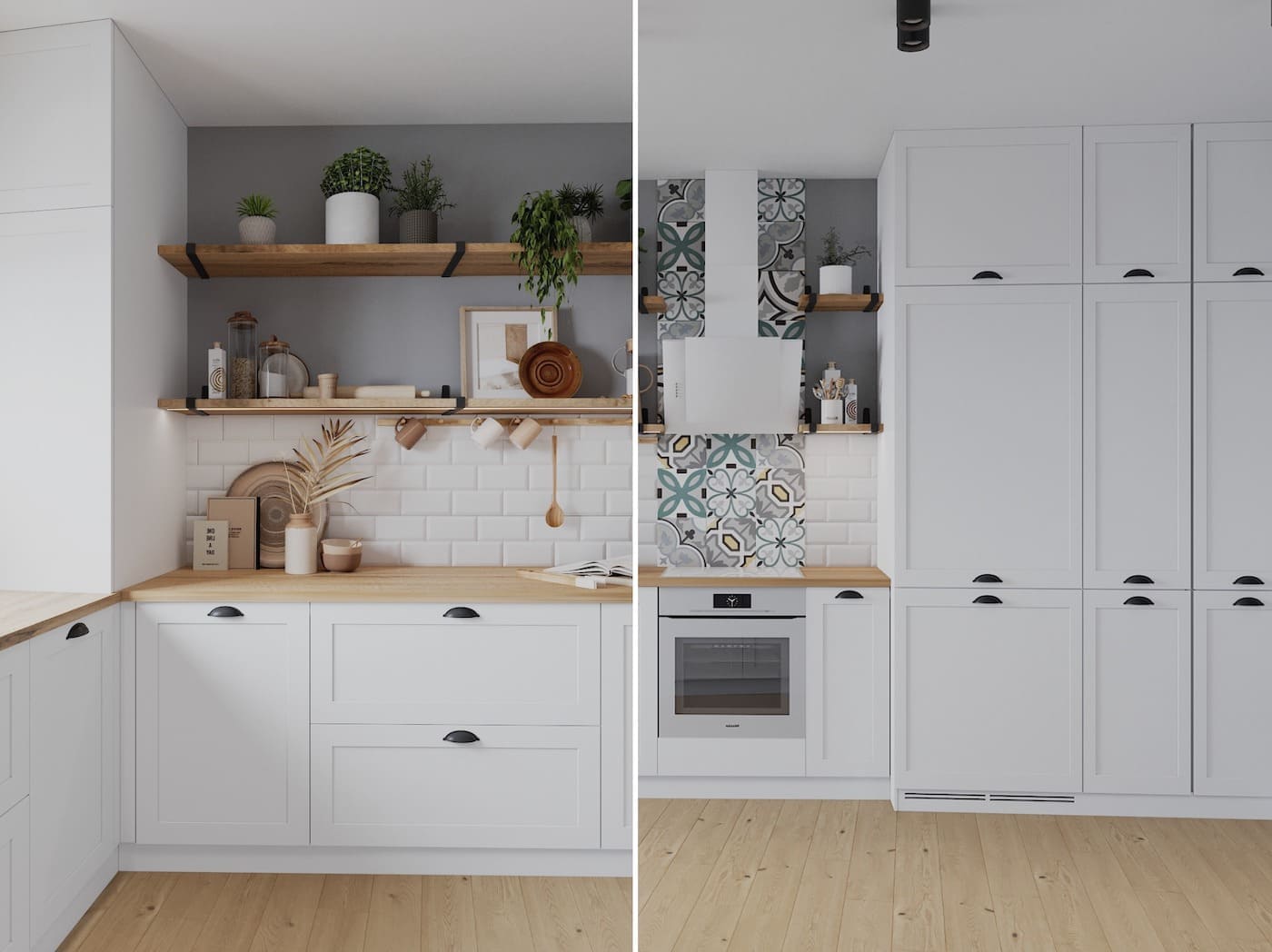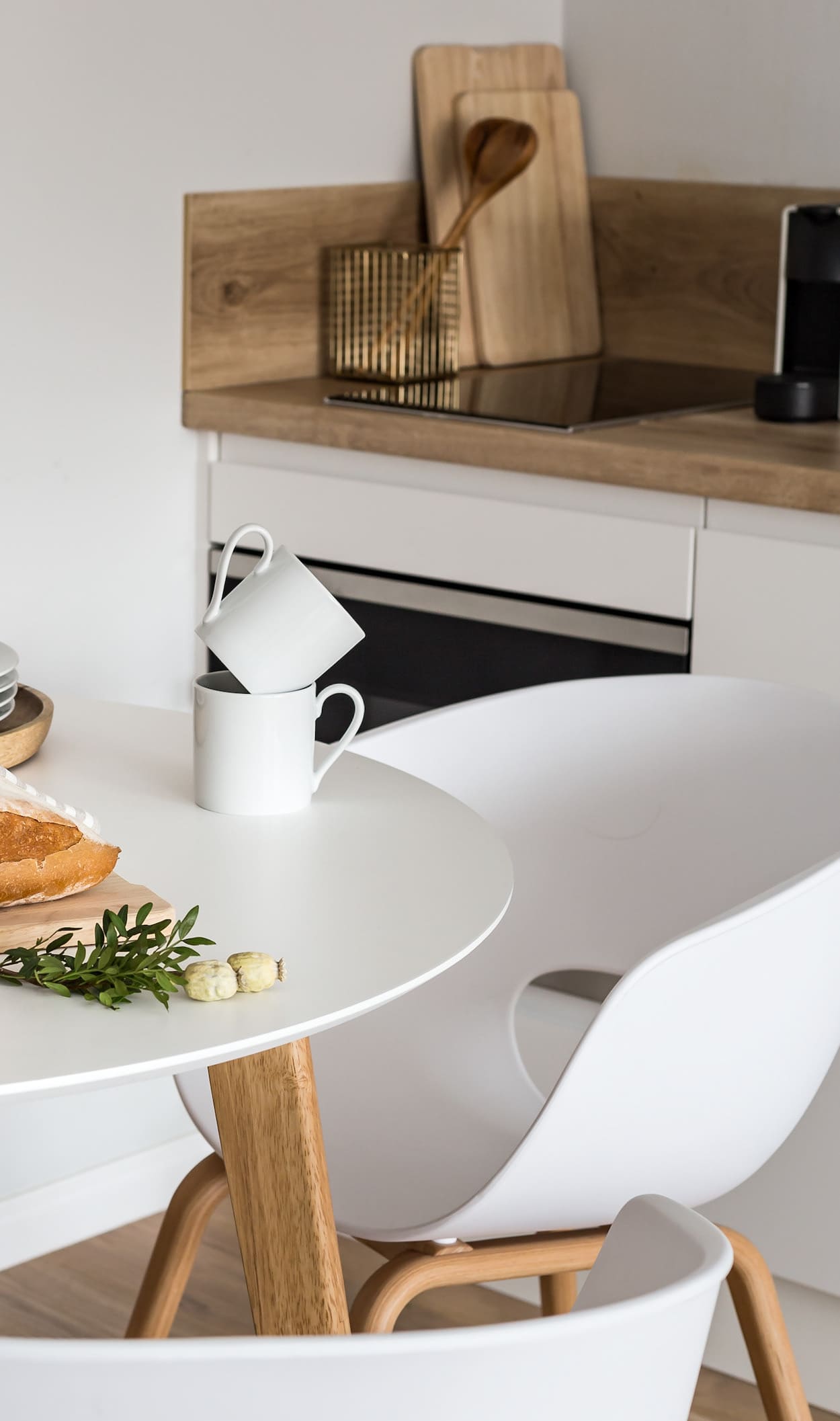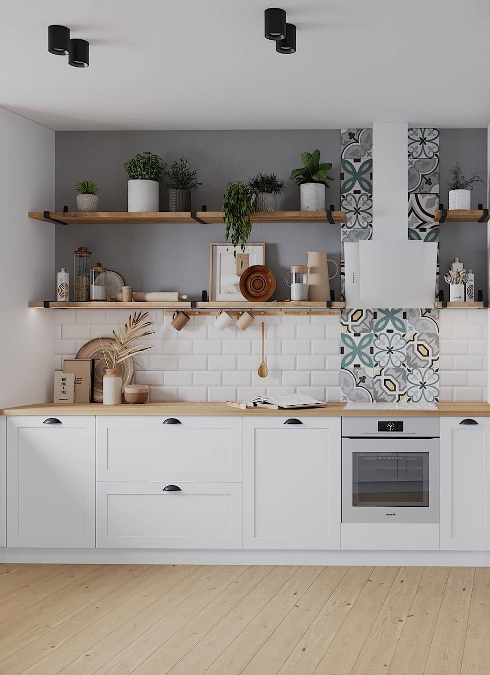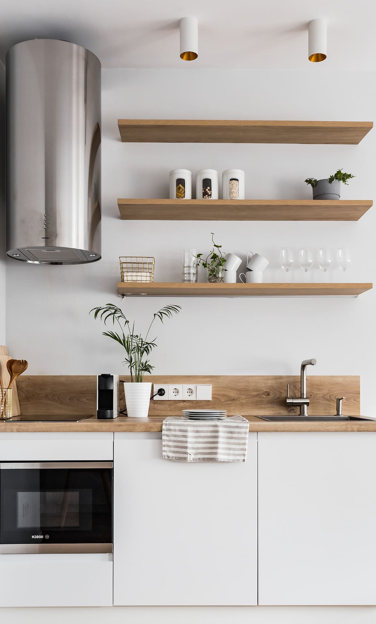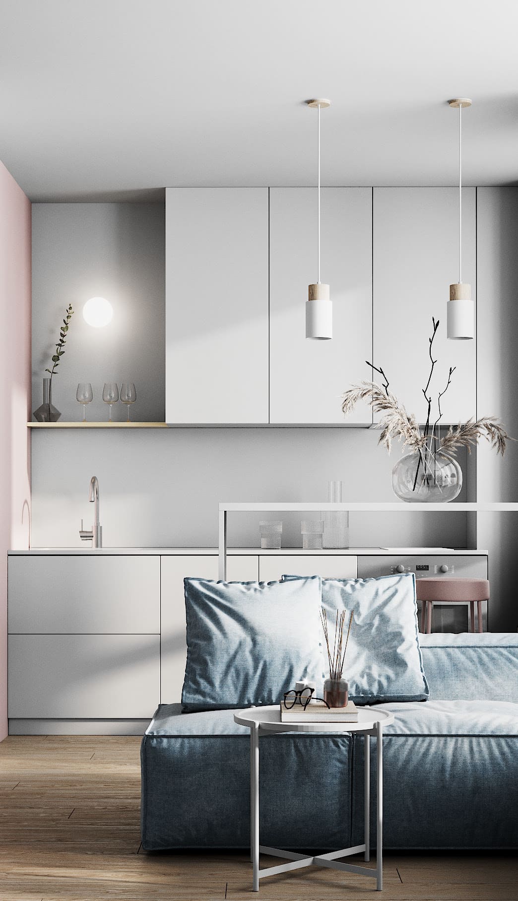 Сдержанность стоит соблюсти и в оттенках стен— чем нейтральнее и светлее, чем лучше. Цвета можно добавить мелкими деталями: посудой, текстилем и т.д.