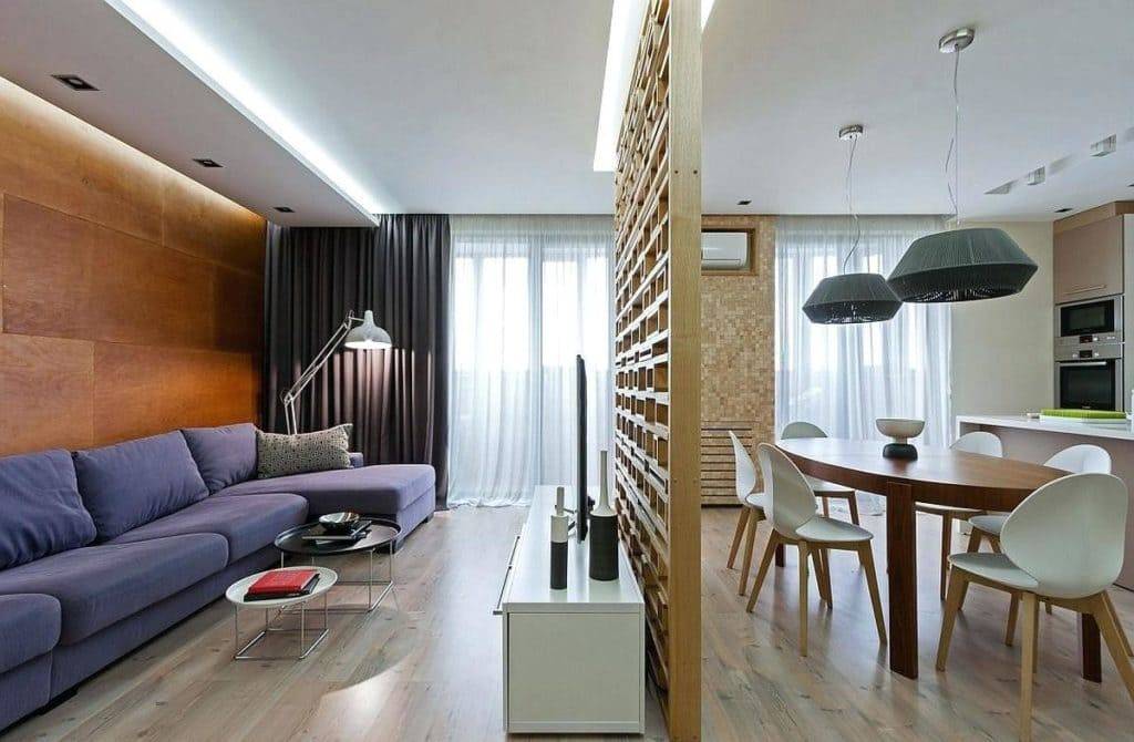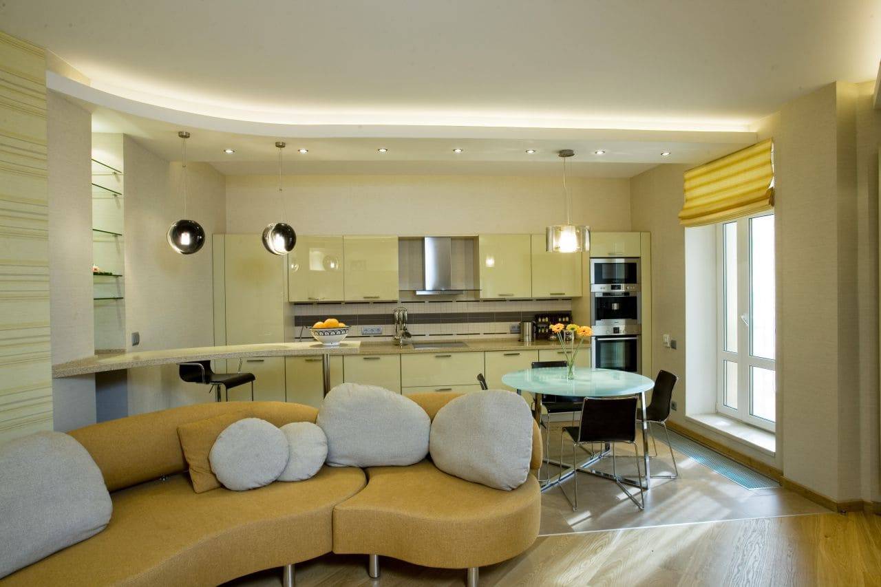 Если вы решили объединить кухню с гостиной, то существует множество вариантов, позволяющих эффектно совместить два помещения. В настоящий момент для деления на зоны применяются следующие методы: