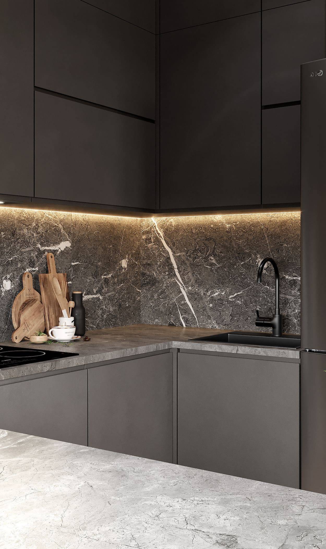 Первоначально определяются с длиной линии гарнитура, подбирая оптимальный размер для размещения всех необходимых элементов в комфортной доступности.