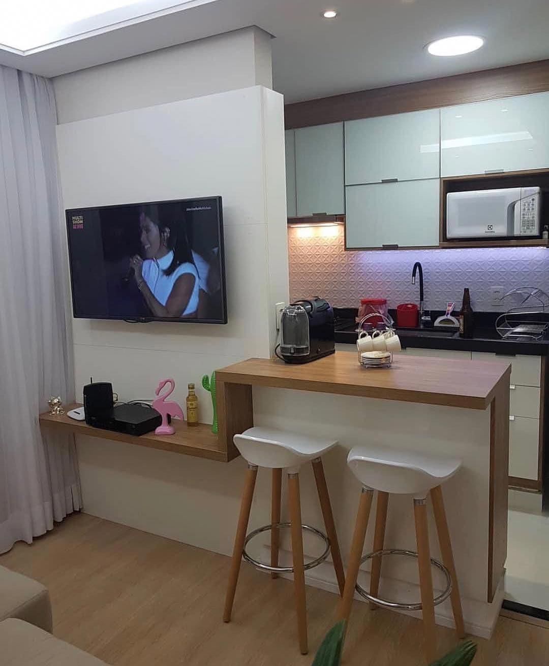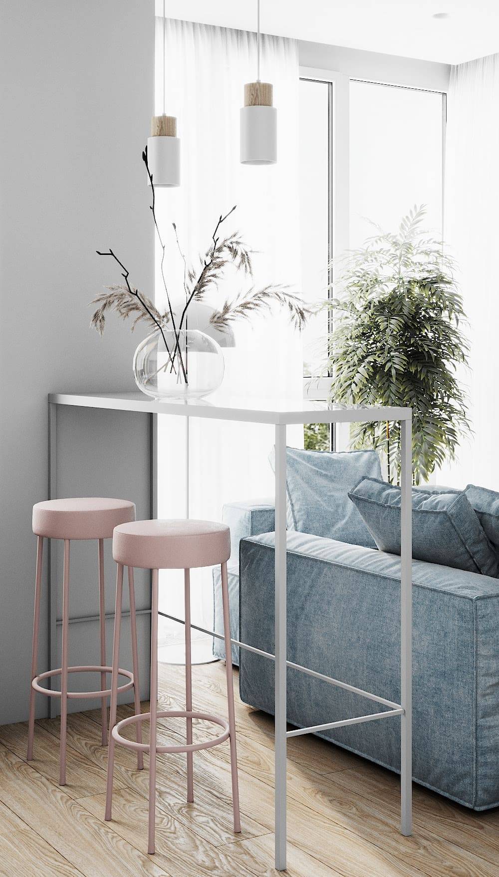 Барная стойка и стулья. Данное решение является не только одним из самых популярных, но и довольно эффективным.