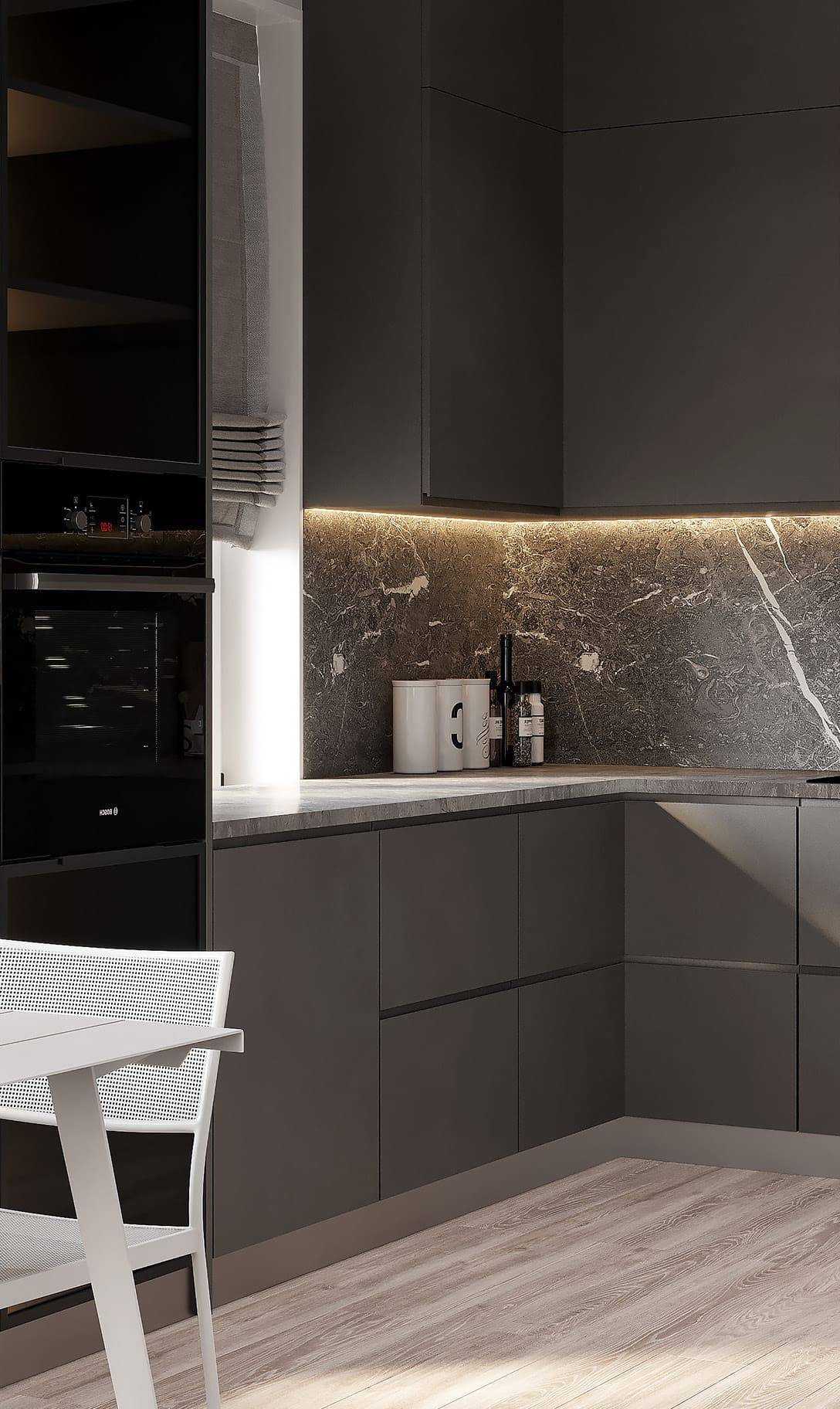 Минимализм. Интерьер маленькой кухни 2023 в стиле минимализм отличается простотой и небольшим количеством мебели. Все пространство четко разделено на зоны, точно выверены все размеры. Для кухни в стиле минимализм характерна функциональность, то есть должен быть задействован каждый сантиметр свободного пространства. Среди цветов преобладают один-два основных оттенка, которые могут относиться как к единой цветовой гамме, так и быть контрастными. Также стиль минимализм не предполагает наличие какого-либо декора.