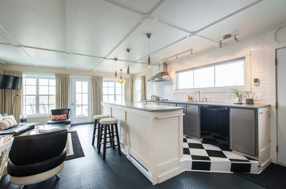 - Полы в кухне и гостиной располагаются на разных уровнях.