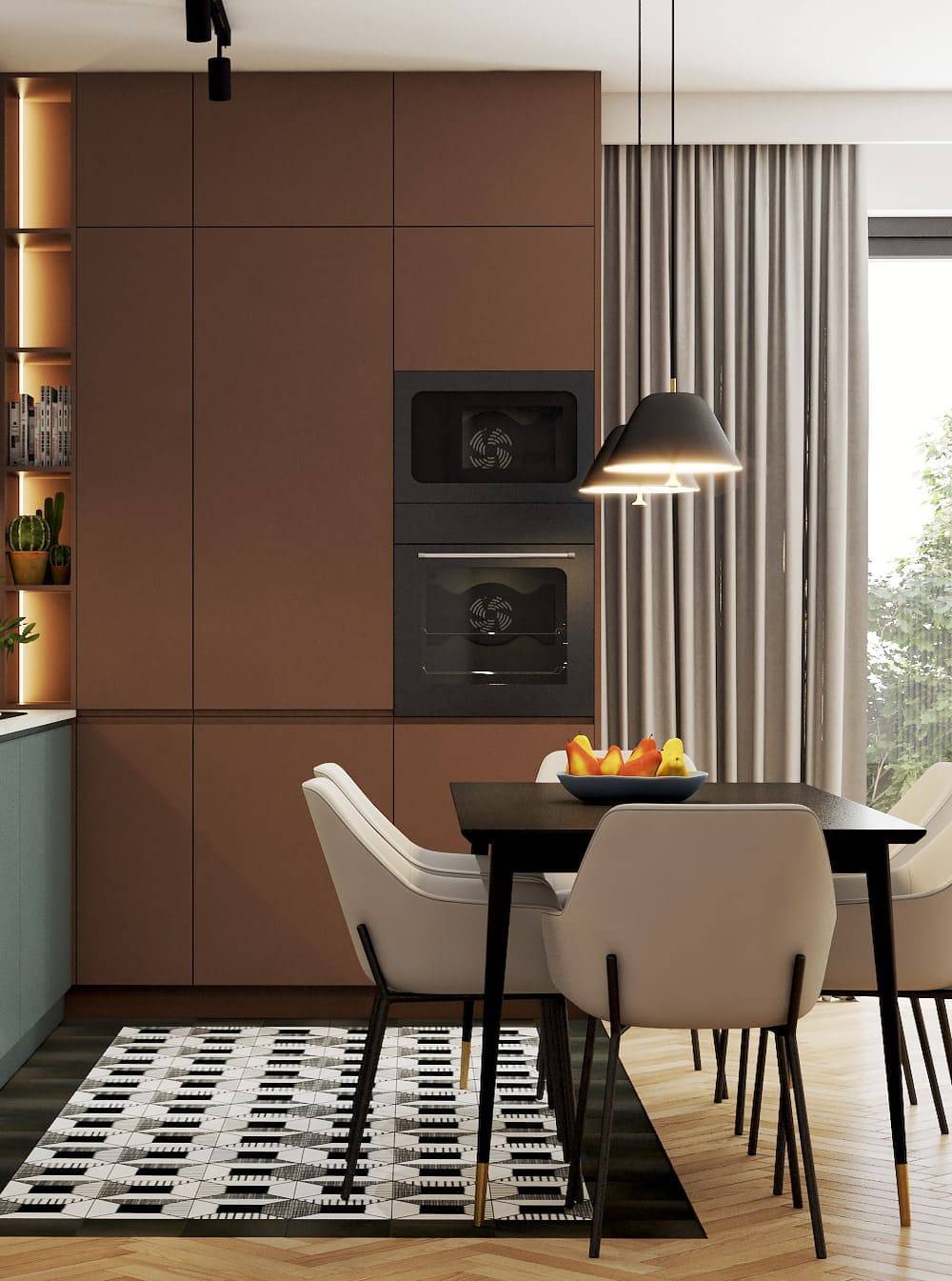 В небольшой кухне-студии, не следует применять коричневую, черную, фиолетовую и другую темную цветовую гамму, так как это поспособствует визуальному уменьшению помещения.
