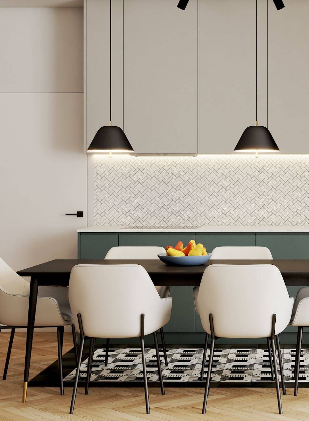 Подходит вариант: обеденный стол + стулья. Такой способ делит пространство, заодно помогает правильно расставить кухонный гарнитур.