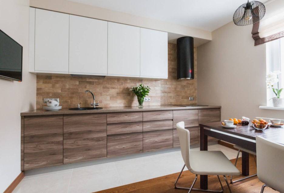 Минимализм в дизайне кухонного интерьера студии на высоте: сдержанные тона серого, бежевого, коричневого и чёрного допускают акценты, а мебель сохраняет эстетический и функциональный облик. Яркие краски допустимы, но в единичном варианте. Это или поверхности, или гарнитур, или стол со стульями.