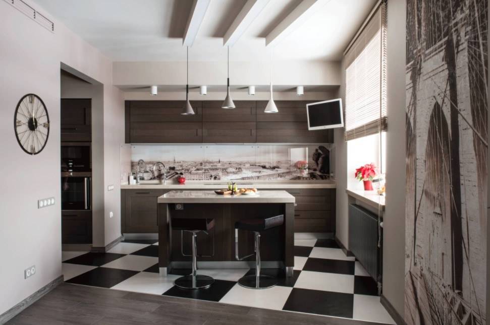 Вот фото одного из вариантов дизайна. Интерьер стильный — да. Но будьте готовы к тому, что вытяжка (даже мощная) все запахи нейтрализовать не сможет.