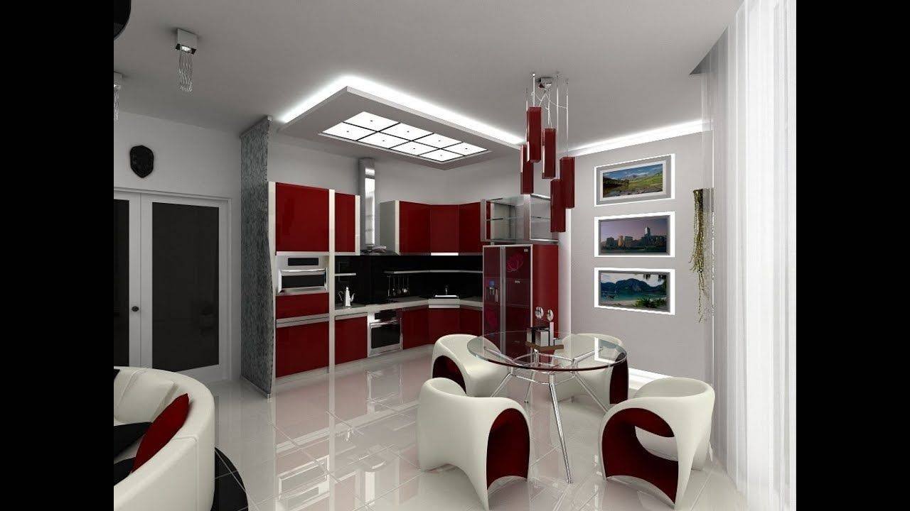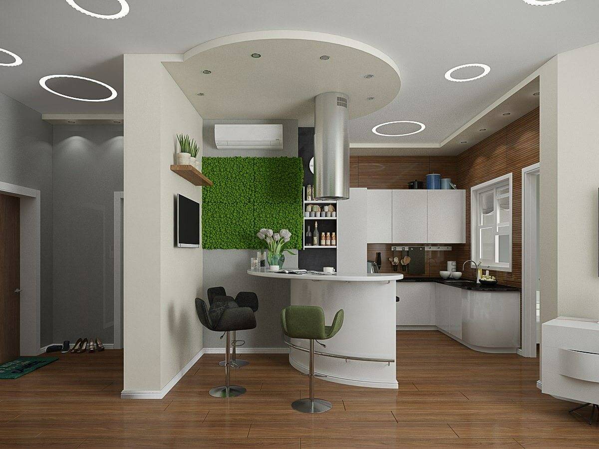 Для кухни-студии важно правильно оформить потолок, так как он выполняет роль разграничения зоны от самой кухни к гостиной. Потолок можно выполнить из гипсокартона, при условии, если помещение просторное