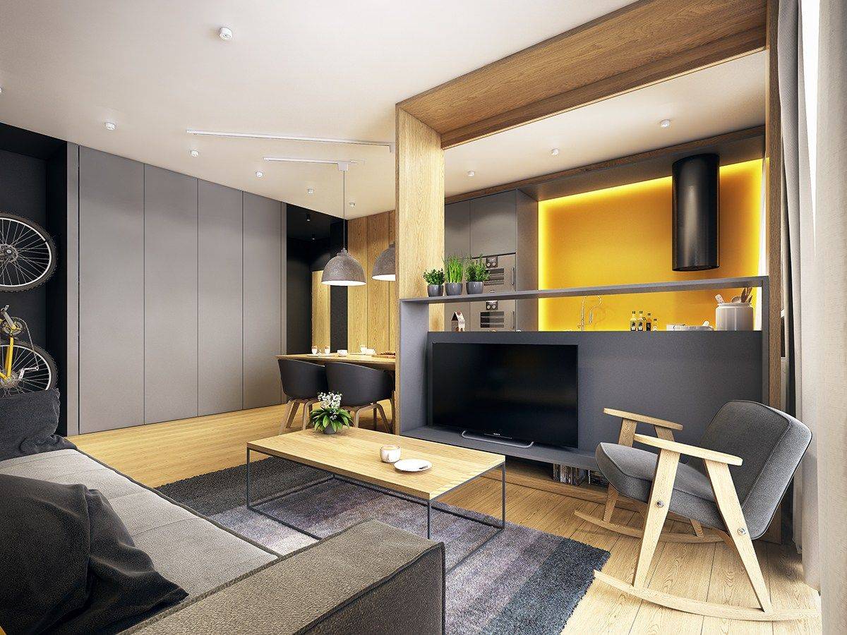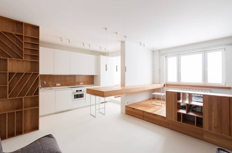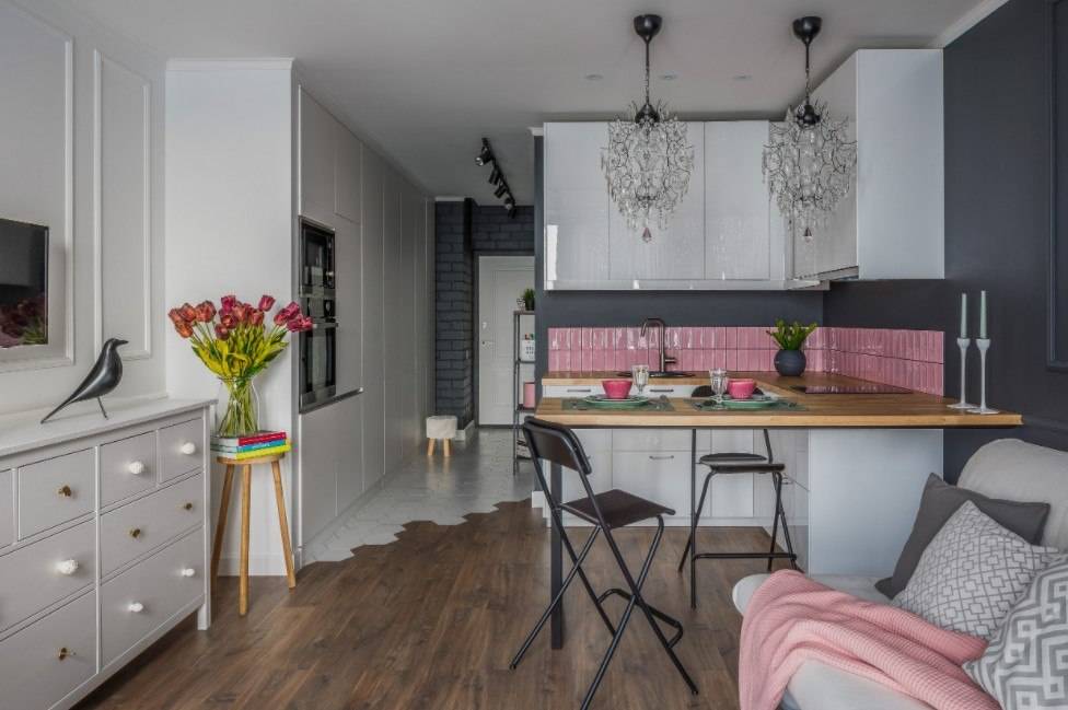 Все места обязаны быть максимально полезными. Лучше отказаться от того, что не будет применяться. К примеру, мебель , предметы, зоны. Если домашний обед не считается традицией, то можно отказаться от громоздкого стола. Отличной его заменой будет стойка для завтрака. Она удобная, занимает очень мало места, сделает вид комнаты стильным.