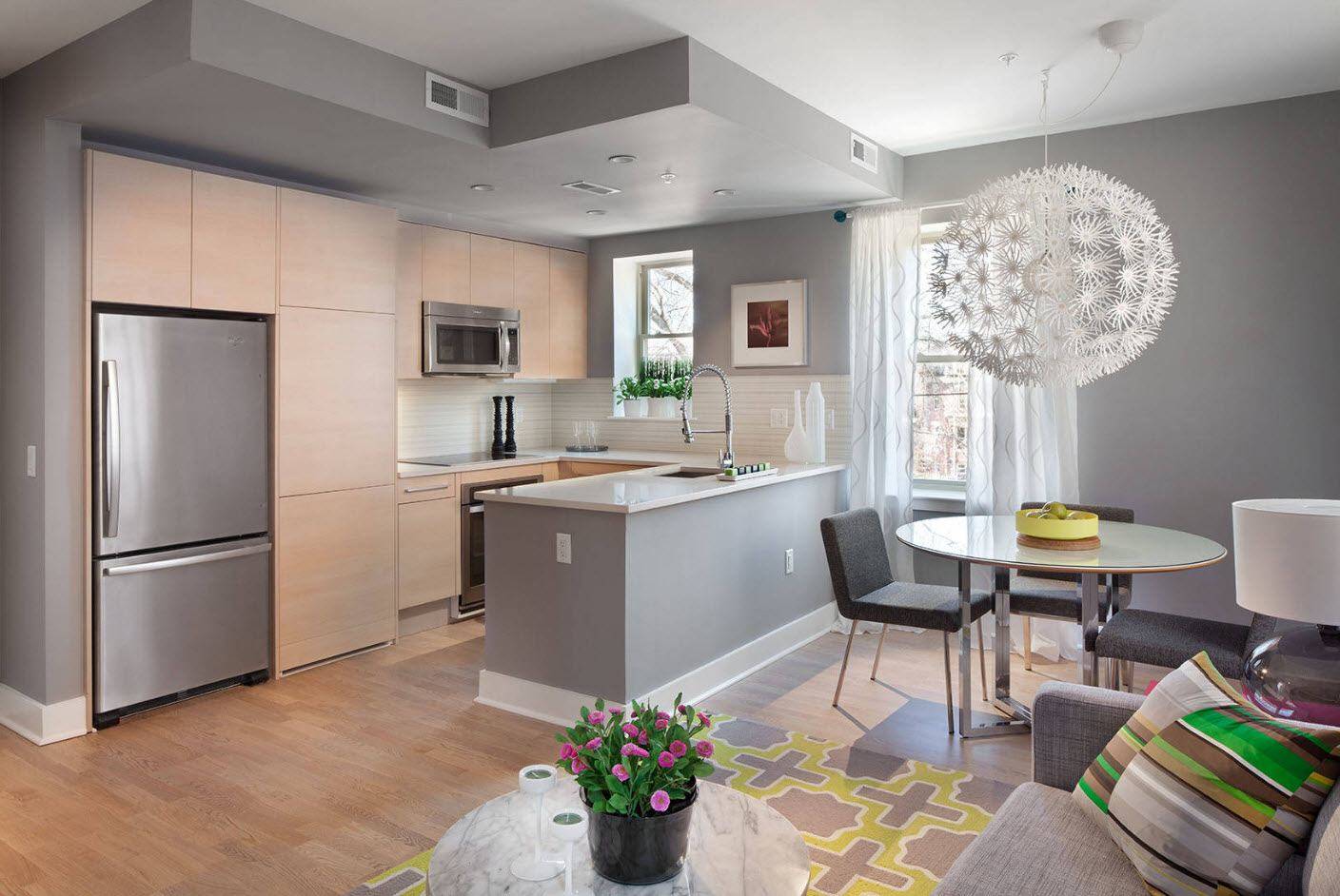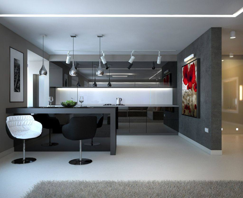 Идеально оформить небольшую кухню в студии в направлении модерн. Интерьер выиграет в свете зеркальных поверхностей, организованных пластиком, хромом, разным стеклом. Всё это обыгрывается плавной геометрической формой мебели и аксессуаров.