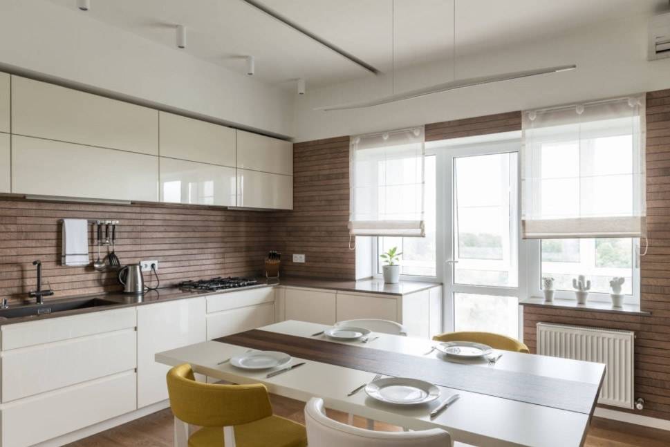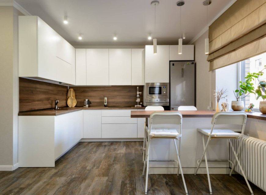 Белую кухню всегда кухно комбинировать с другими цветами, чтобы не получить больничную палату