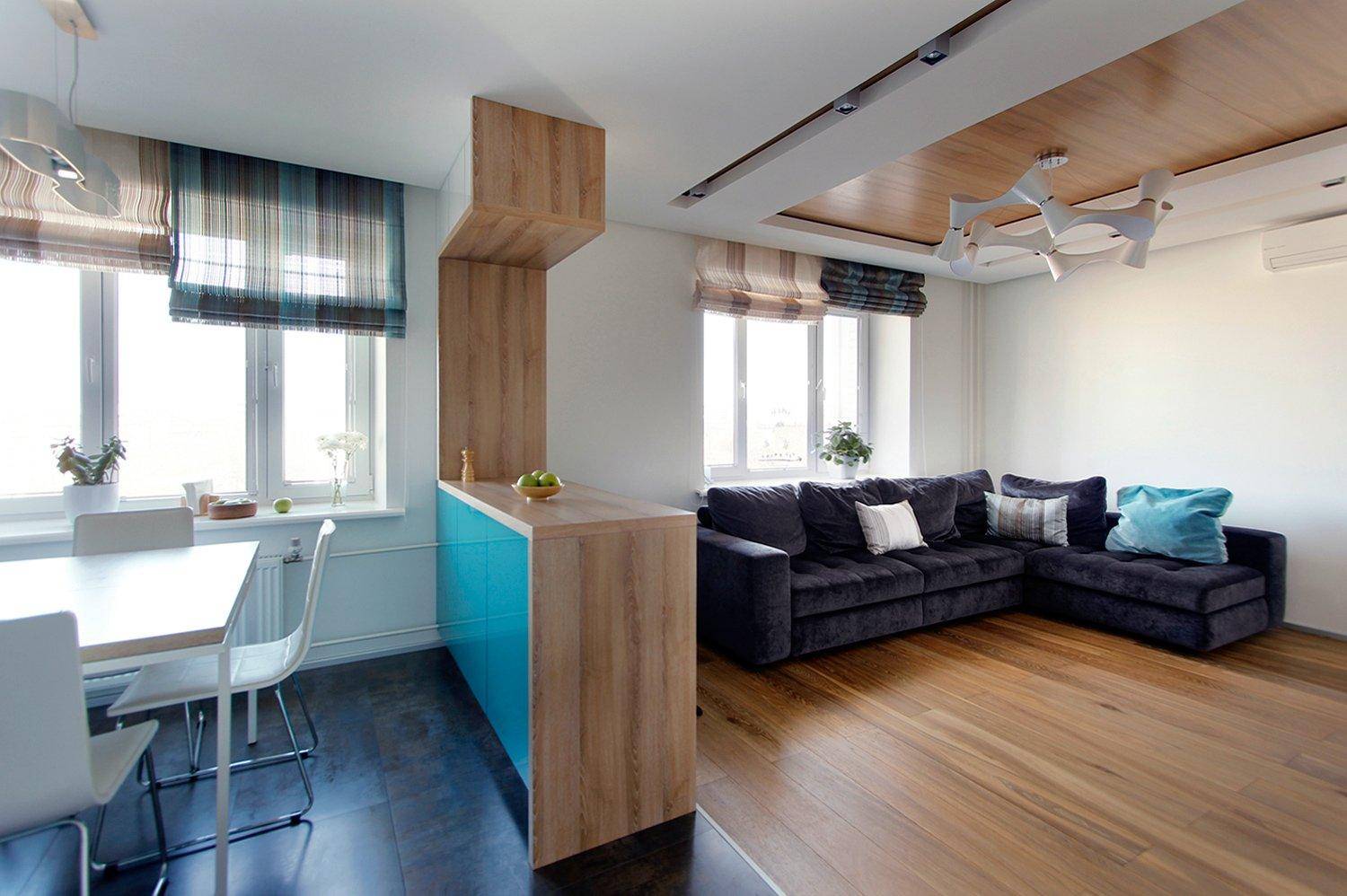 Наиболее удачным вариантом отделения кухонной зоны считают использование барной стойки, оборудованной столешницей, встроенными выдвижными ящиками и подставками. Барная стойка будет гармонично работать на замыкание пространства кухни и, в то же время, нести функциональную нагрузку.