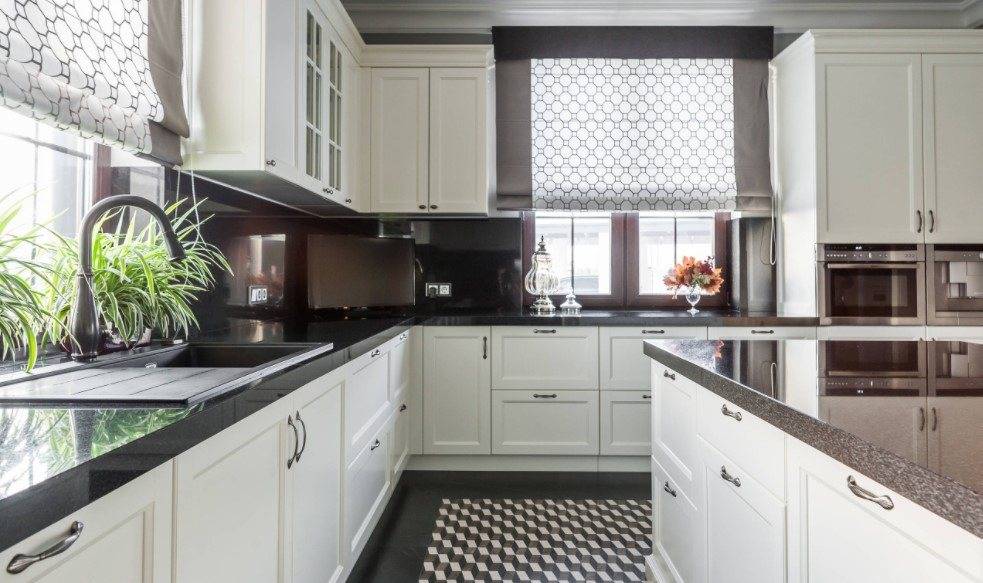 Интерес вызывает П-образное размещение гарнитура, что даёт дополнительные рабочие поверхности. В маленькой комнате дизайн позволяет использовать подоконник как зону для столешницы или стола.