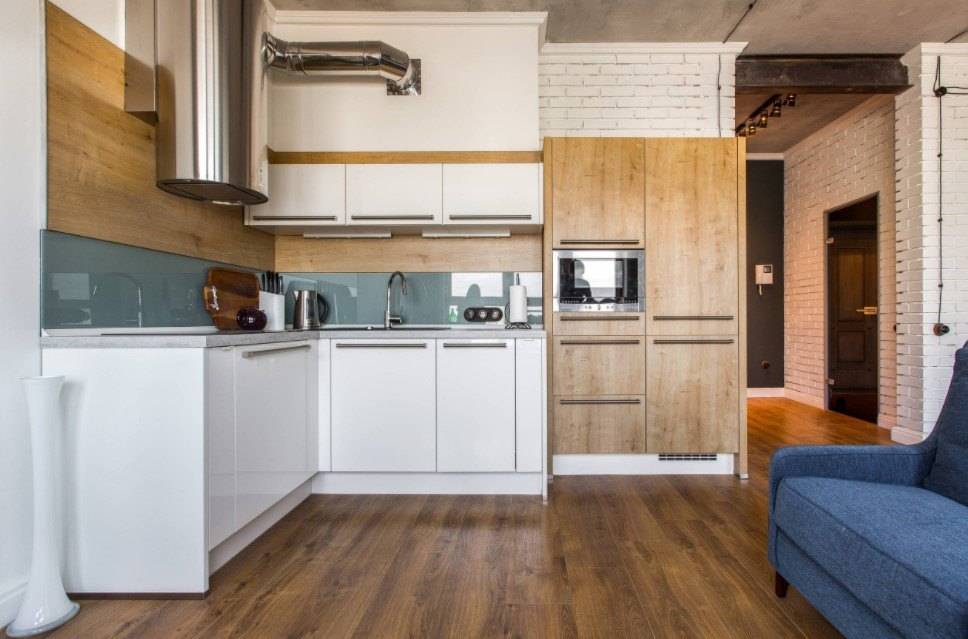 Кухонный интерьер небольшой квартиры в стиле лофт оформляется в неброских тонах. Это расширяет пространство комнаты. Рекомендован приём выбеленного кирпича в сочетании с ярким фартуком.