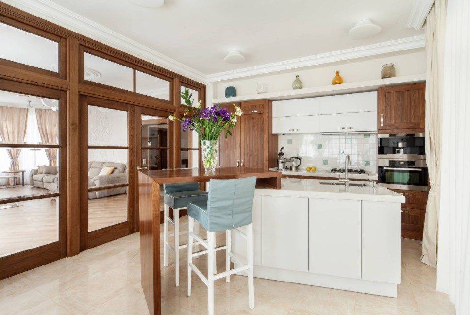 Для визуального разделения кухни, совмещенной с гостиной используют: