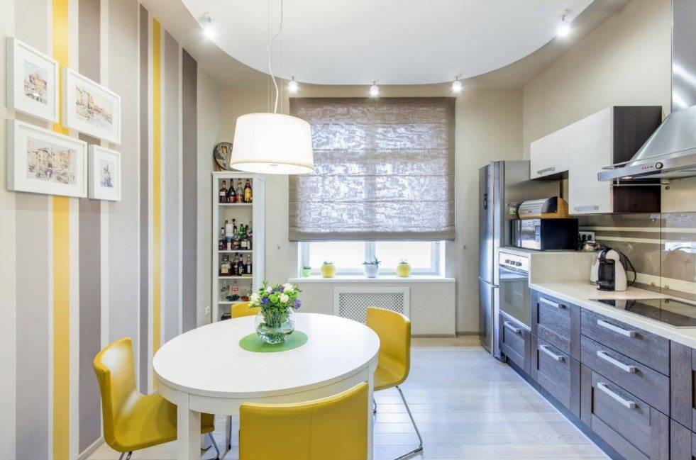 В помещениях с невысокими потолками рекомендуют натяжной потолок, глянцевая поверхность полотна и правильно подобранные светильники помогут визуально увеличить кухню. При желании на полотно можно нанести цветочный принт.
