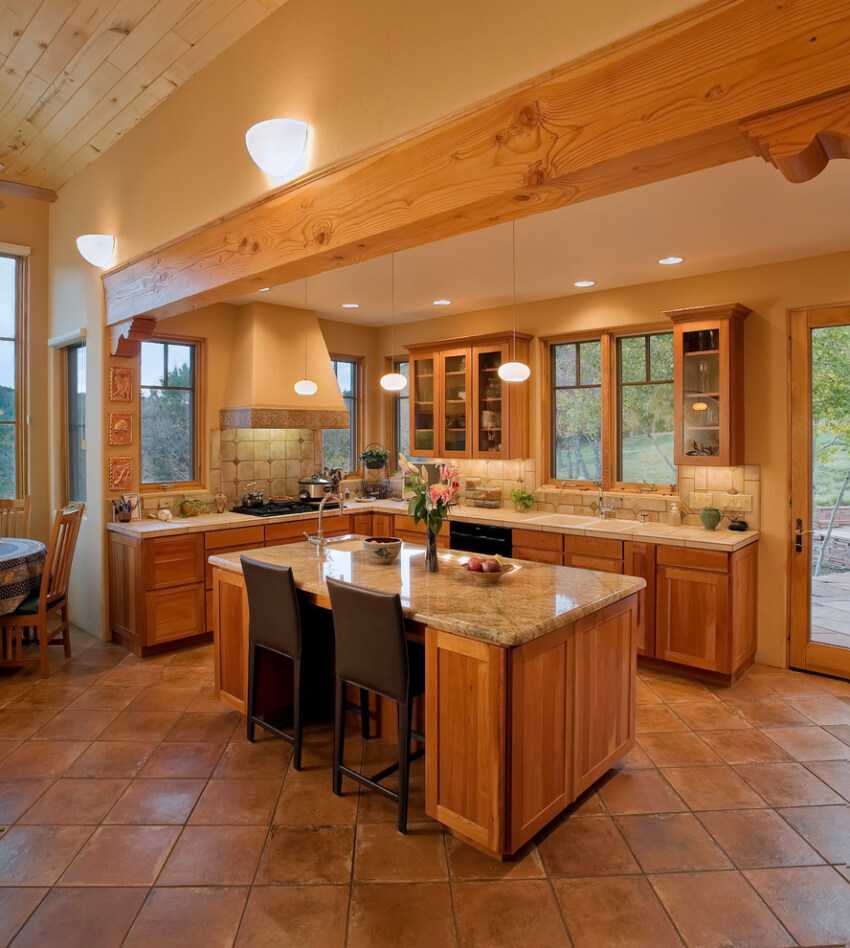 Второе условие – зонирование. В центре кухни расположить остров. Выбранный стиль не позволяет обойтись без этого, расставить мебель вокруг комнаты для него не подходит. Благодаря своей красоте и пользе кухонный остров прочно входит в число популярной у американцев мебели.