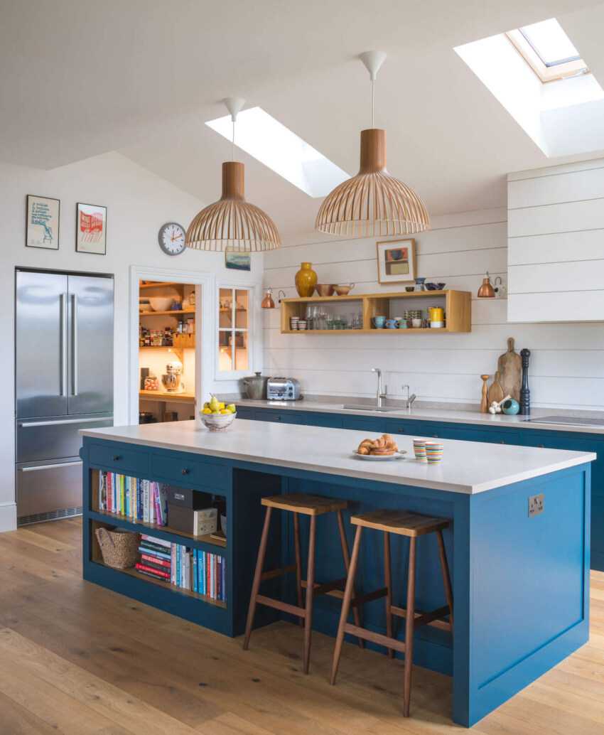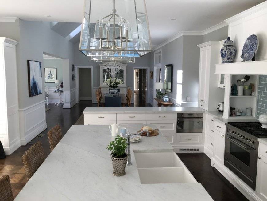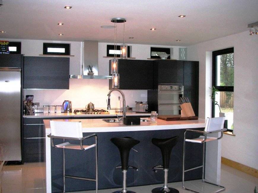 - Остров и/или барная стойка освещается крупной люстрой или двумя-тремя подвесами.