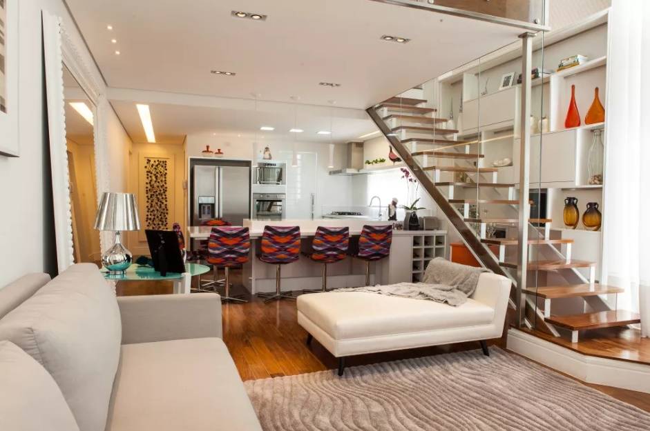 Как и всегда, все отрицательные моменты являются продолжением достоинств. В случае с открытой лестничной конструкцией, расположенной в кухне, последняя превращается в проходное помещение.