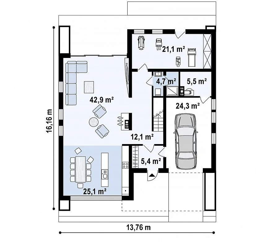 Хотя кухня и гостиная размещены в одном большом зале, разделение происходит благодаря зонированию внутренней отделкой и небольшому «притоплению» в заднее крыло дома. Здесь же выход на террасу.