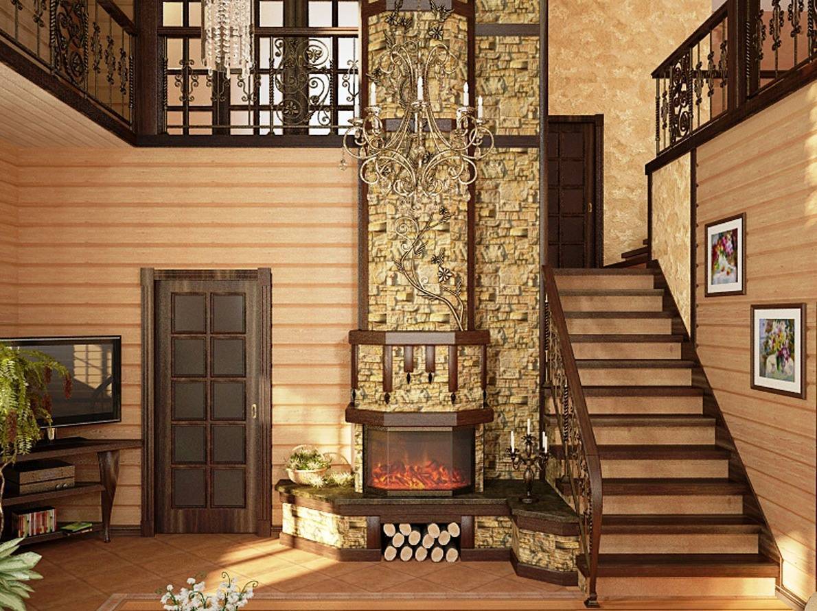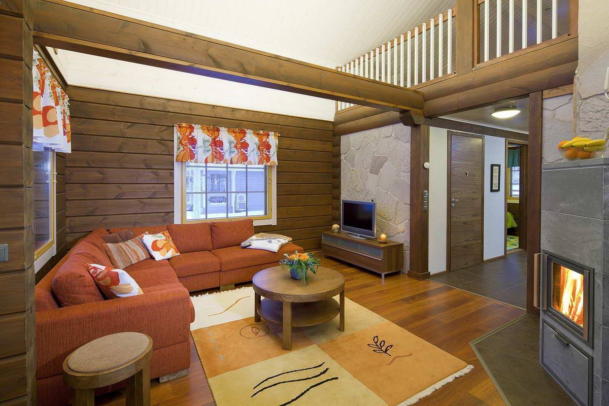 Важнейшим атрибутом гостиной в деревянном доме является камин. Его основные функции: