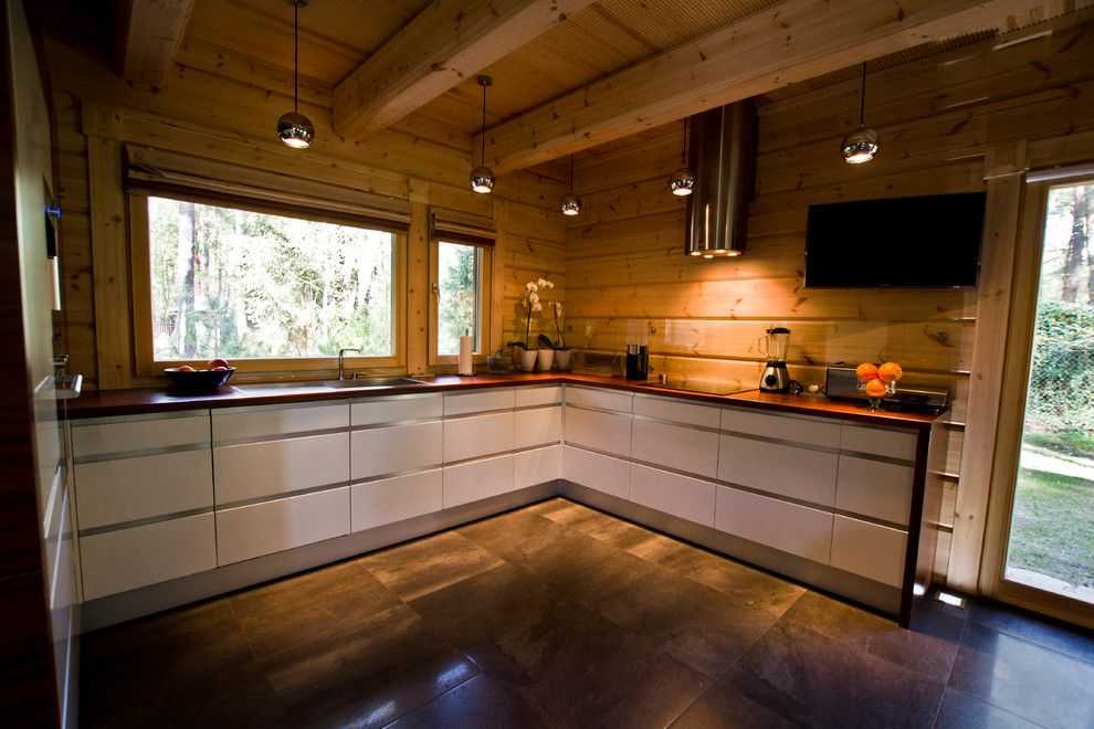 Эко-стиль П-образной кухни. Стены сруба выкрашены в белый тон, а мебель отражает натуральную текстуру. Такой приём поможет найти баланс между экологичностью и современным дизайном.