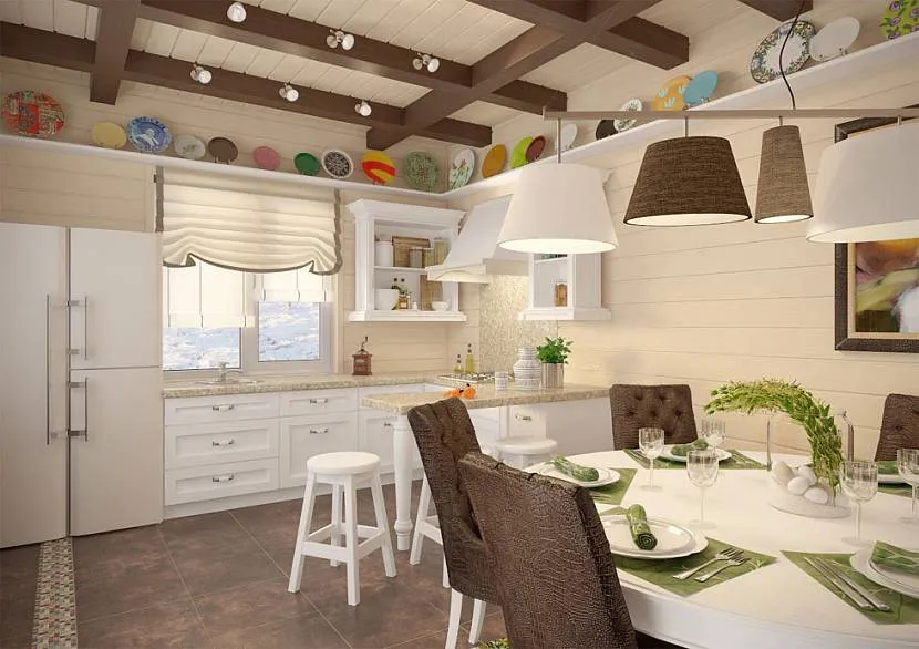 Современная кухня белого цвета будет шикарной на фоне кремового или едва желтого круглого бруса. Эффект растрескивания или состаривания добавит уюта и неожиданности. В таких помещениях необычно обставляют обеденную зону. Практически на всю площадь пола ставится длинный прямоугольный стол и твердые стулья. Обязательным текстильным дополнением служит скатерть на столе. Для оформления оконных проемов используются римские или рулонные шторы. Они зачастую повторяют цвет стен, не имеют рисунка.