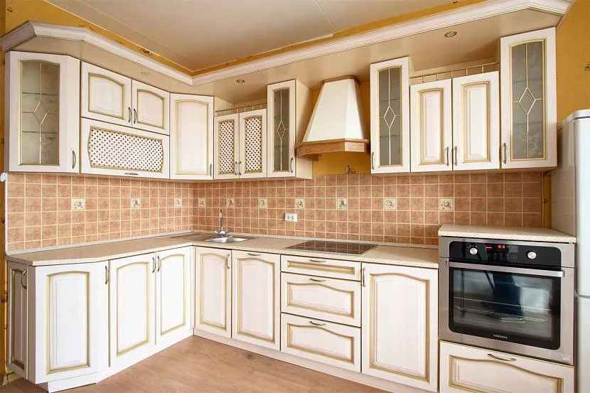На кухнях средних размеров устанавливают угловой гарнитур. Мебель и техника располагаются у двух или трех смежных стен.