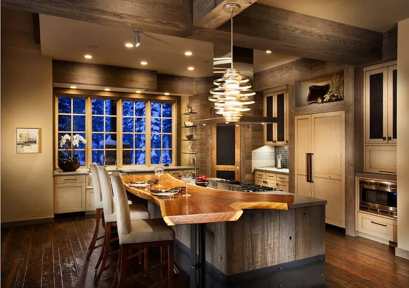 Отличная идея с организацией деревянных ниш. В них удачно помещается различного размера гарнитур и встраиваемая бытовая техника. Широкое окно может иметь габаритный подоконник, который послужит рабочей зоной. Если позволяет свободное место, то в помещении можно поставить островок. В качестве столешницы эффектного центрального дополнения может послужить вырезанная из широкого ствола дерева доска. Перед применением ее рекомендуют вскрыть лаком.