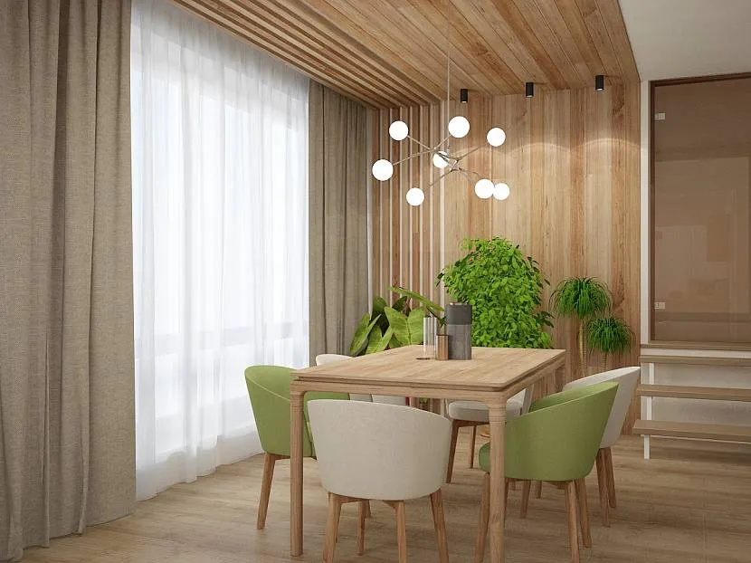 - Дерево — один из главных элементов в эко-дизайне. Его естественная текстура и цвет создают уютную и теплую атмосферу. Деревянная мебель, полы и отделка стен могут быть выполнены из различных пород дерева, таких как дуб, сосна, береза и т. д.