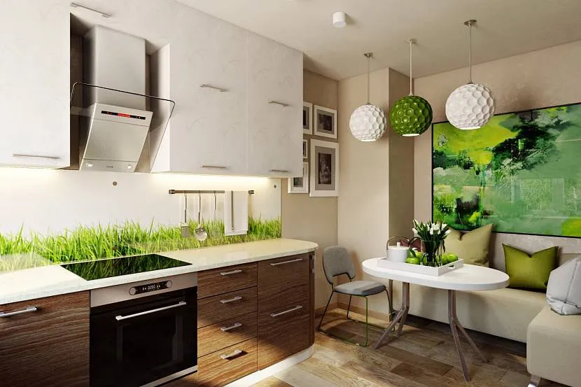 Потолок и стены окрашивают в светлые цвета теплых оттенков. Гармонично смотрится эко кухня, дизайн которой предусматривает облицовку поверхностей вагонкой, деревянными панелями или кафельной плиткой. Допускается отделка стен обоями с растительным принтом или рисунками животных. Оригинальным решением станет украшение одной из стен фотообоями с 3D изображением красивых пейзажей.