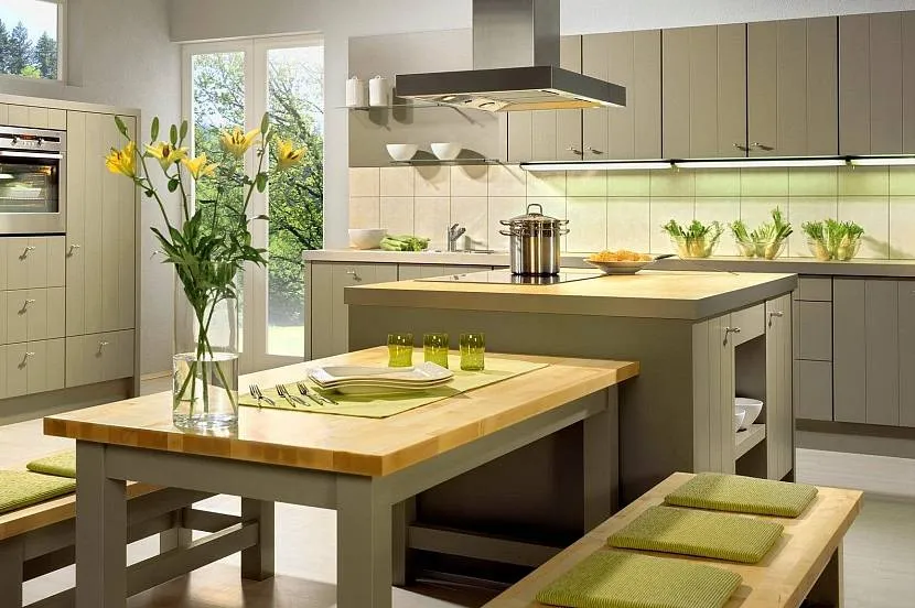 Экодизайн предусматривает выбор кухонного гарнитура в пользу массива дерева. Но этот дорогостоящий вариант можно несколько удешевить. Стиль позволяет использовать дерево только для изготовления фасадов и видимых боковых стенок шкафов. Остальные детали, в этом случае, делают из прессованных стружечных плит.