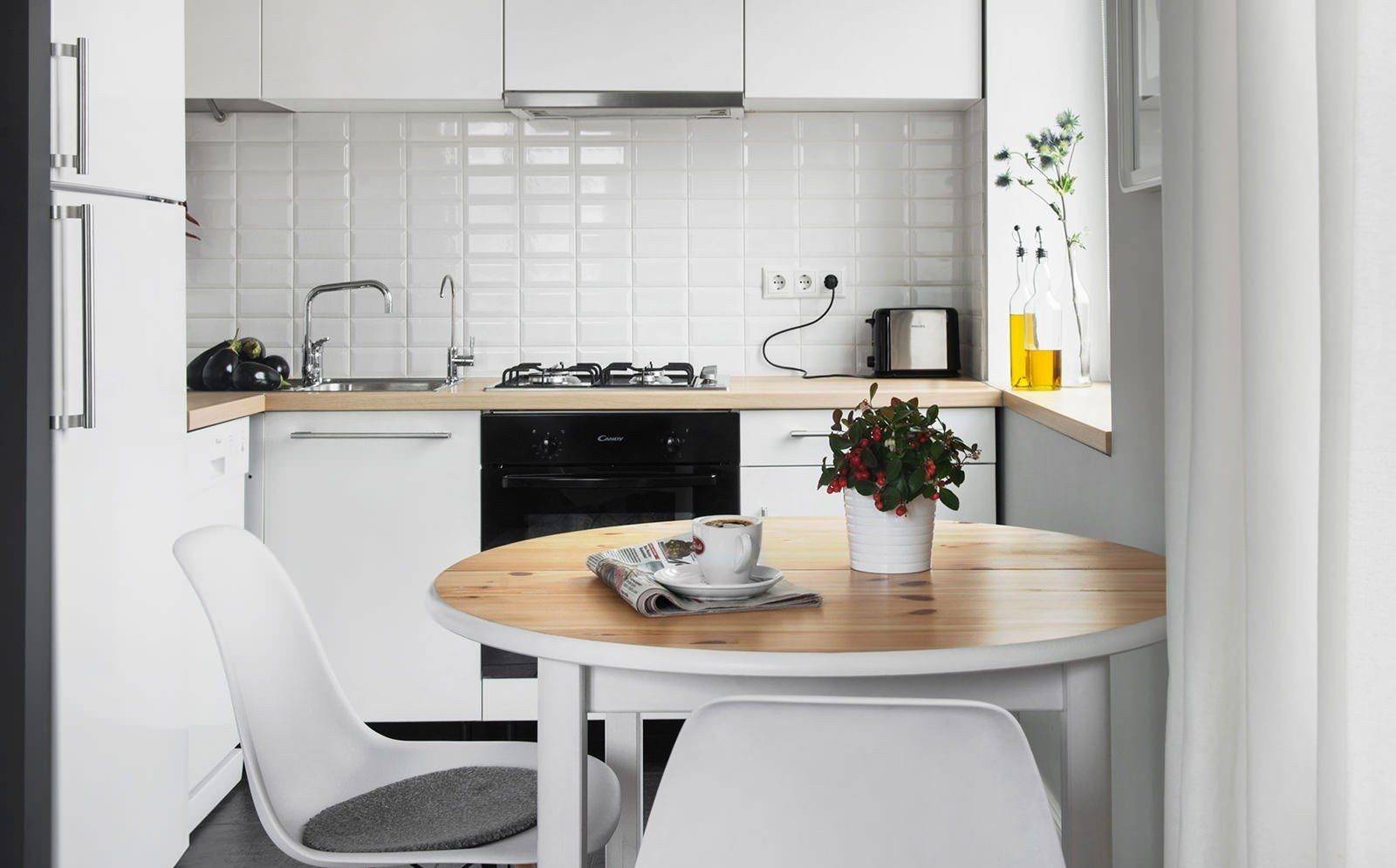 Традиционный большой обеденный стол будет определённо велик для вашей кухни. Поэтому стоит задуматься о том, чтобы сделать ваше помещение более оригинальным. К примеру, вы можете сделать стол из подоконника, который можно будет складывать после приёма пищи. Также вы можете установить барную стойку и сделать её частью Г-образной угловой мебели.