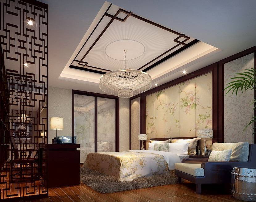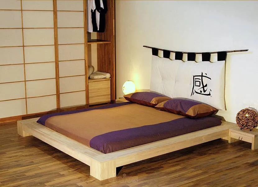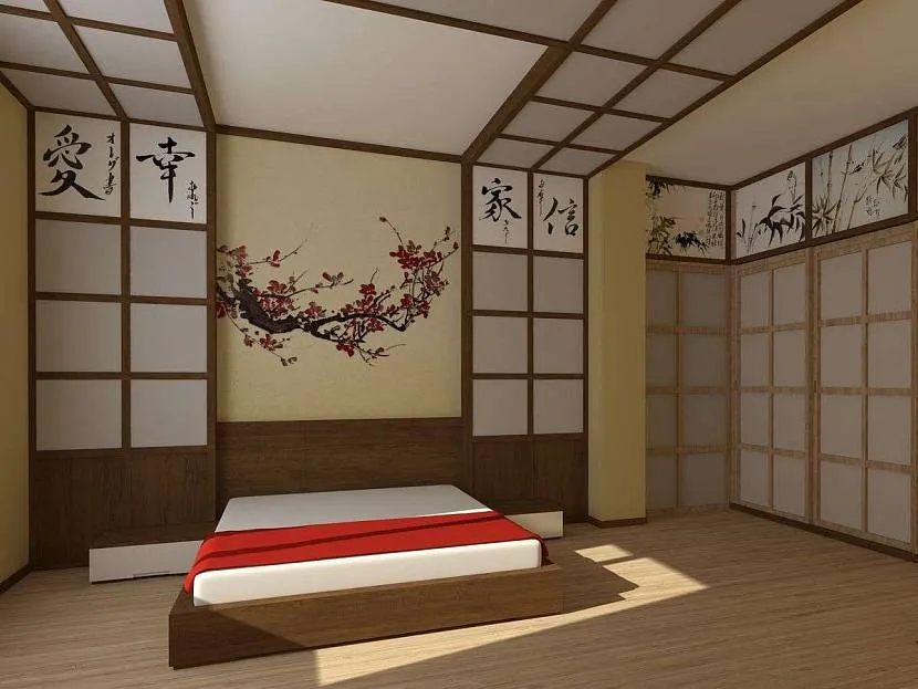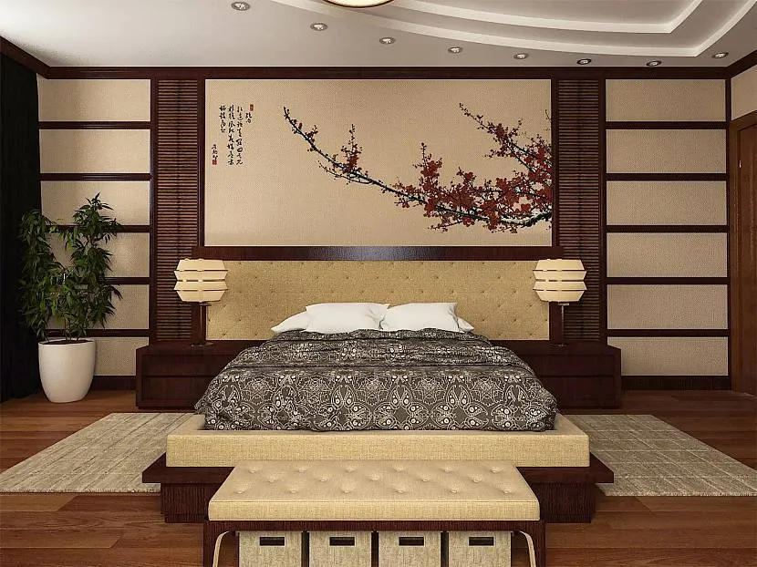 Над изголовьем часто вешают расписанные полотна до потолка, но в современных интерьерах их часто заменяют стеклянными. Впрочем, можно это место занять фотообоями с изображением драконов или кривых сосен, растущих на вершине скалистого утеса. Хорошо впишутся в интерьер высокие разноцветные светильники из бамбука и рисовой бумаги и высокие напольные вазы.