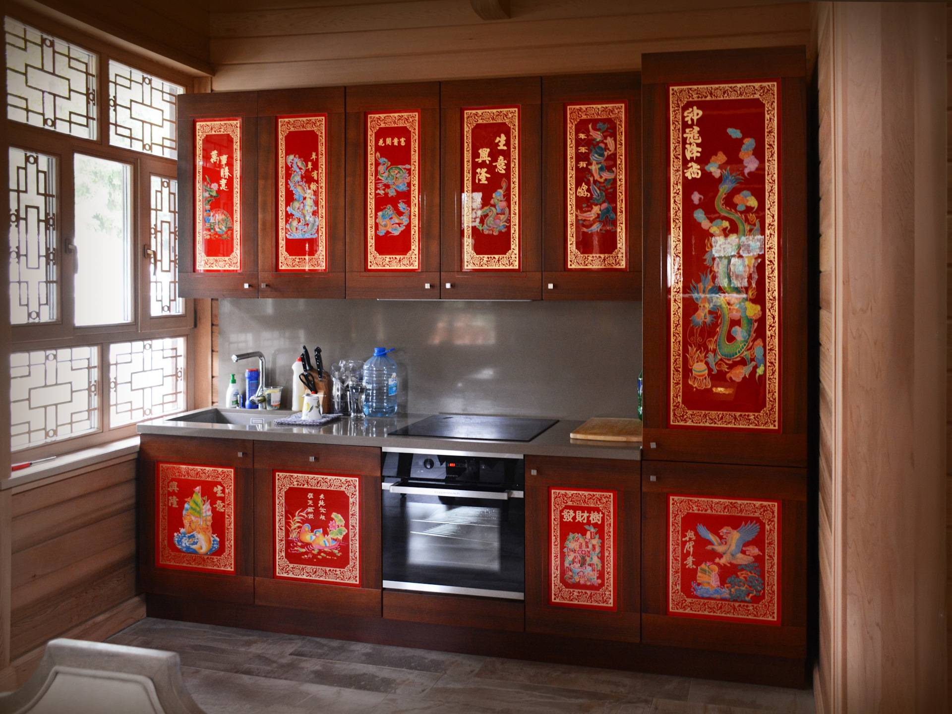 В качестве отделочных материалов фасадов подбирайте панели из дерева, МДФ, акрил, моделирующий камень или настоящее дерево. Что же касается матовости или глянцевости — здесь все может зависеть от типа кухни и ваших желаний. Очень прекрасно смотрятся мягкие сатинированные фактуры — они зрительно наполняют кухню мягким свечением, отличительным для китайских интерьеров.