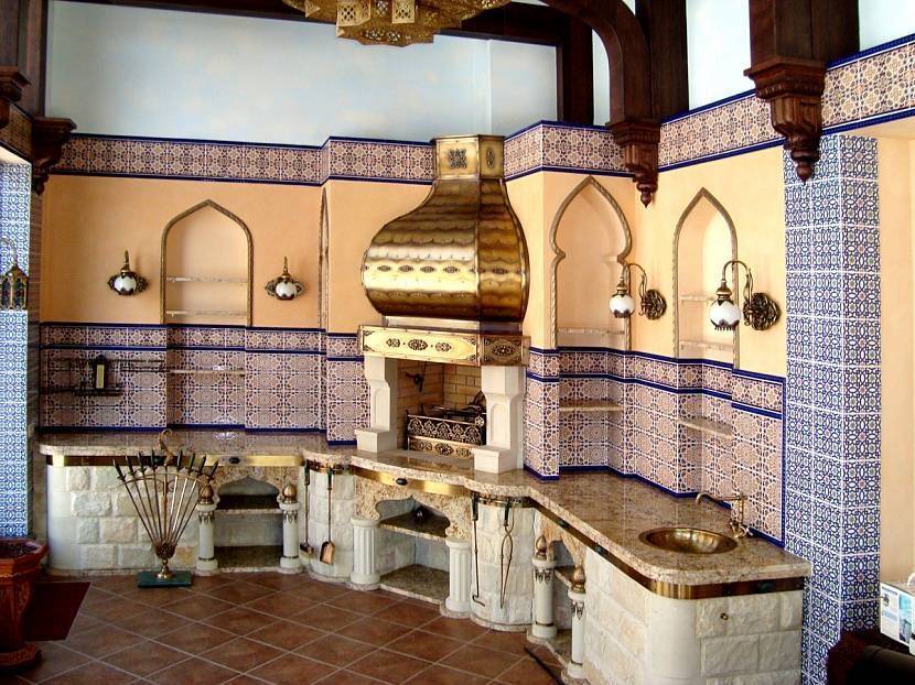 Во многом кухня в узбекском стиле схожа с арабским интерьером. Здесь так же уместны колоритные орнаменты, узоры и мозаика. В числе основных цветов – золотой, черный, голубой и зеленый. Мебель лучше выбирать резную, при этом в таких помещениях активно используют комоды, сундуки, кресла и столы.