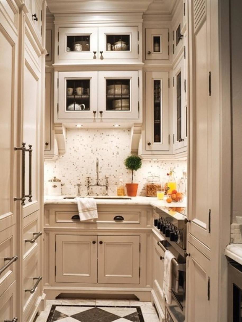 Для светлого фона помещения подойдет светлая мебель со стеклянными вставками, к тому же, она тоже увеличивает пространство. Дверь в классической кухне можно заменить арочным проёмом. Также избавиться от двери можно, соединив небольшую кухоньку с гостиной, если есть такая возможность. Будет дополнительный простор, а стилевые особенности сохранятся.